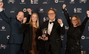 Vnderholdet bag Faxe-dronekampagnen fejrer prisen i Portugal. Fra venstre: Mike Olesen, marketingchef Visit Sydsjælland & Møn, Nanna Kildemose Nielsen, projektleder Visit Sydsjælland & Møn, instrøktør Anders Konghaug fra Kongshaug Productions samt Ane Dolward, der er projektleder i Turisme Faxe hos Business Faxe. Foto: World Tourism Film Awards CIFFT.