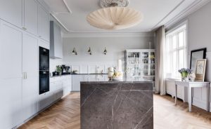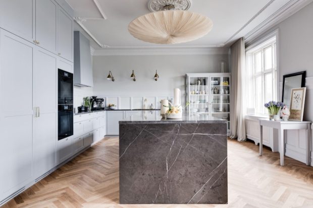 Bordpladen spiller en central rolle i køkkenets udtryk. Her vælges ofte natursten som marmor eller kalksten – blandt flere muligheder – eller kvartsit, hvis der ønskes ekstra robusthed. Hver sten har sit eget spil af årer, farver og struktur, som står i smuk kontrast til egetræets varme.