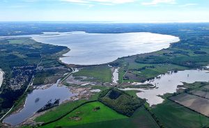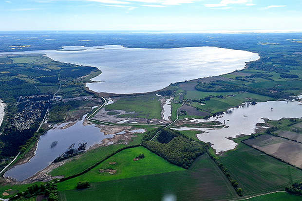 Nederst i billedet ses det område, der blev oversvømmet og vådlagt i 2023. Øverst i billedet ses Præstø Fjord. Foto: Naturstyrelsen.
