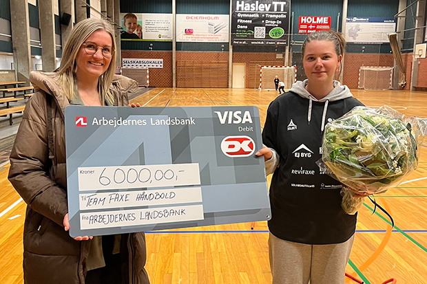 En af dem er Josephine Kaagaard fra Team Faxe Håndbold, og forleden mødte Majken Bjørklund Thomsen, der er privatkundechef i Arbejdernes Landsbank Næstved, derfor op i klubben for at overrække præmien.