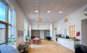 Indvendigt er der også tænkt bæredygtigt. Hvor moderne byggeri ofte benytter gipsvægge med metalskinner, har Møn Bakkeby valgt skillevægge i træ – som i gamle dage. Træet lagrer CO₂, mens det vokser, og frigiver det ikke igen. Det er en organisk tilgang, der skaber et sundt indeklima, understøttet af naturmaling med høj åndbarhed.
