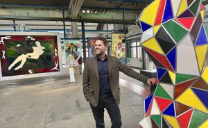 Henrik Hvenegaard Mikkelsen i Hebsgaard-hallen på Holmegaard Værk. Foto: Museum Sydøstdanmark.