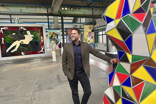 Henrik Hvenegaard Mikkelsen i Hebsgaard-hallen på Holmegaard Værk. Foto: Museum Sydøstdanmark.