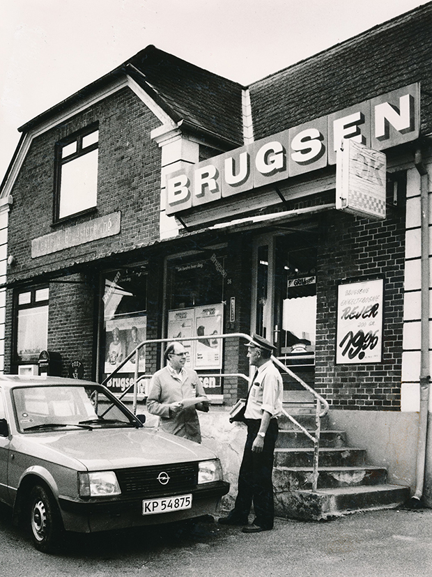 - Brugsuddeleren og postbuddet udveksler nyheder foran Brugsen i Leestrup. Foto: Faxe Kommunes Arkiver.